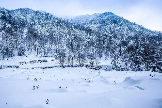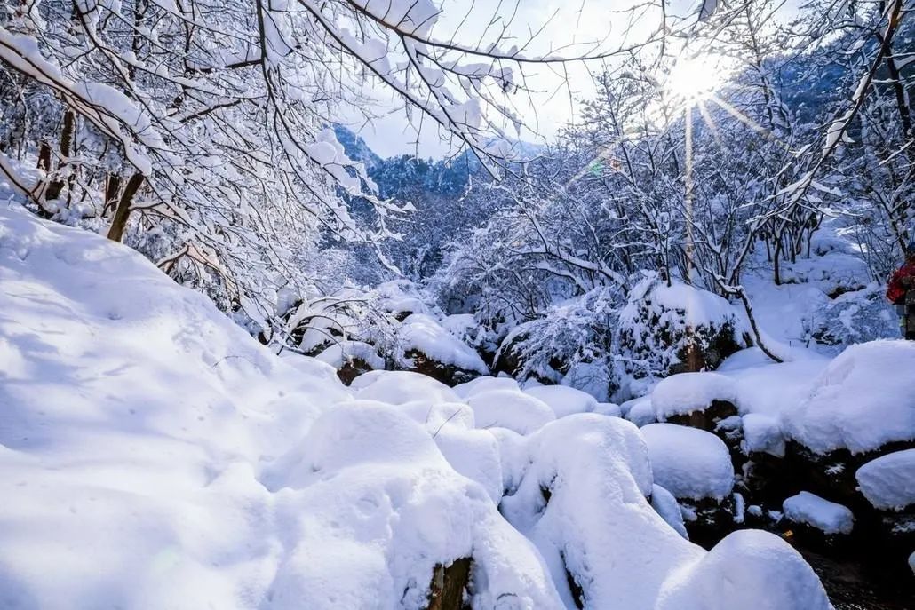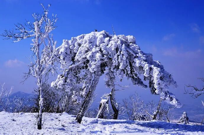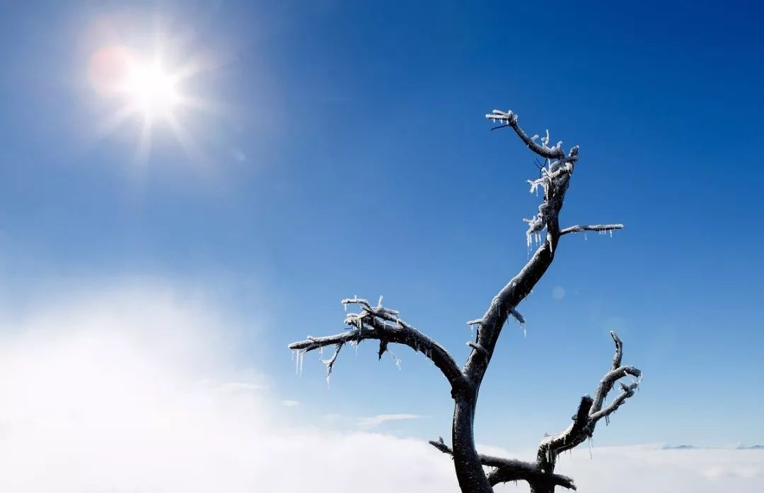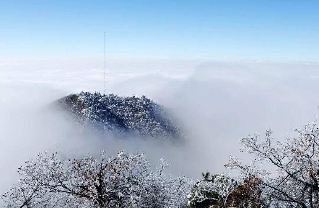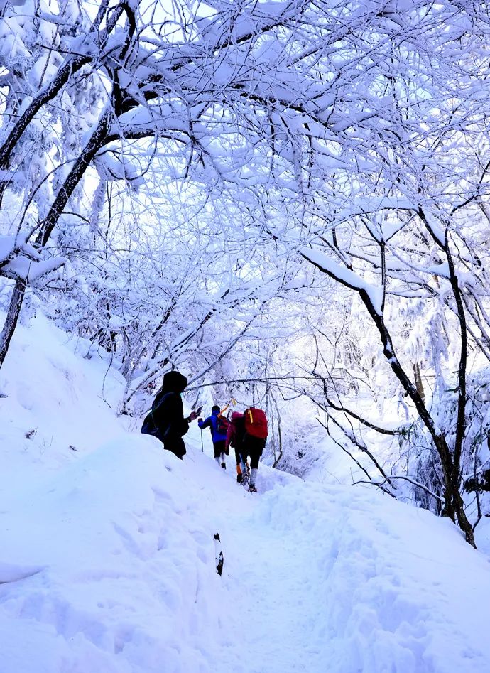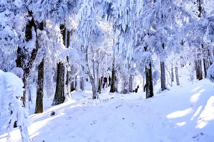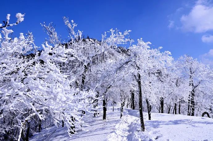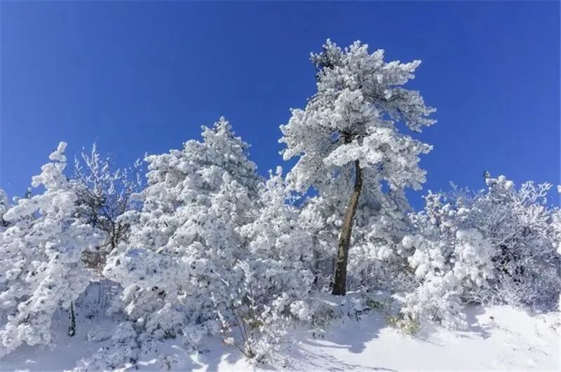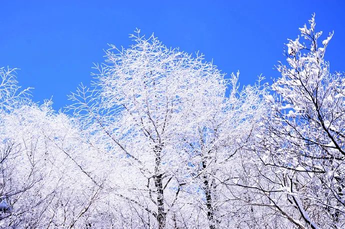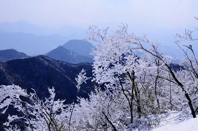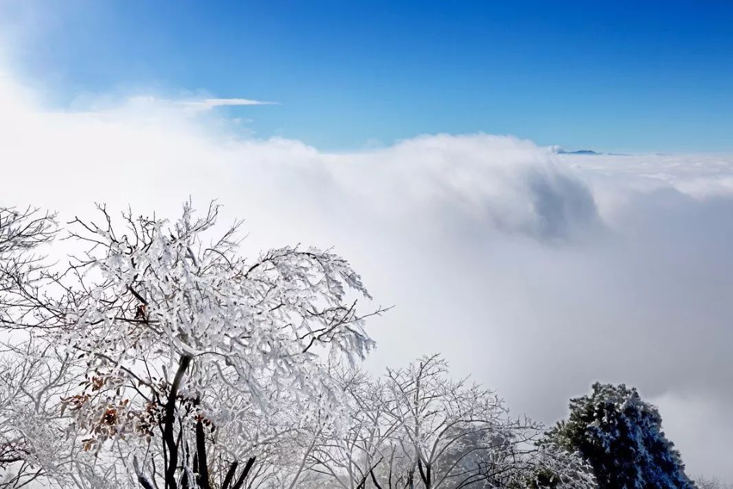 过杏梅坞,继续向上,树丛越来越密,大有林海雪原的感觉。树枝上覆盖着晶莹剔透的霜雪,近观玉树凌空,琼花烂漫;远望,白茫茫一片,仿佛上一秒还是漫天飞雪。