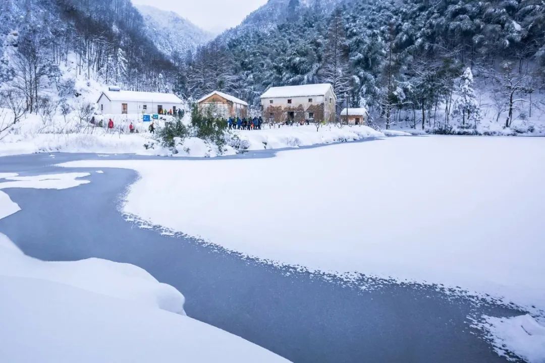 约9:00后我们来到瑶坞村。下车整顿徒步进山,沿着蜿蜒的小路一路向上,1.5小时左右到了分岔口,先往瀑布的方向走,大约20分钟经过手脚并用的攀爬之后,映入眼帘的就是落差百余米的瀑布,在瀑布底下拍拍美照,(兴许还能看到冻瀑!)稍事休息折返。小路去往林场水库,午餐我们就在水库边的林场解决,大山深处水库边午餐别有一番滋味,如遇到下雪天气,雪景,让人仿佛置身于大东北的林海雪原中!吃饱喝足我们就要往最高峰-杏梅尖攀登了!土路居多,大家看好脚下,到了山脊左转走十分钟就看杏梅尖的石碑了!拍拍照,看看被大雪覆盖住的山峦,野趣亦然。适时下山。