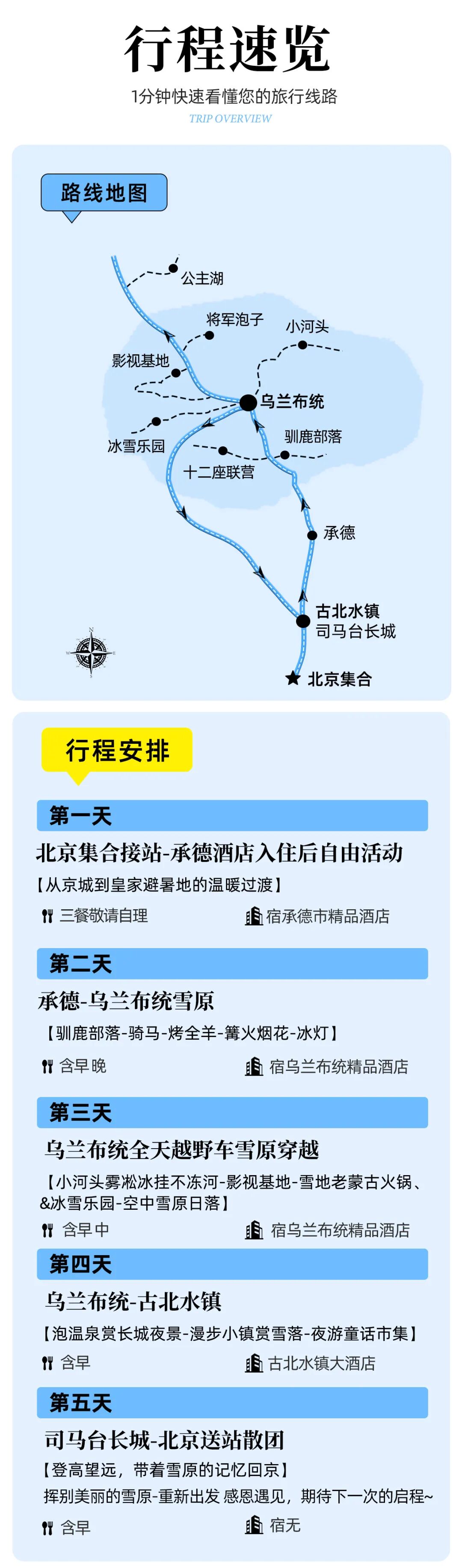 冬日雪原,乌兰布统5日活动,保成行!请先报名,客服确定团期余位后,大交通会第一时间通知购买。 去程:D1下午14:30北京南站出发 回程:最后一天,D5 北京南站散团,北京南站请订16:00以的车次,首都机场17:30后,大兴机场18:30后