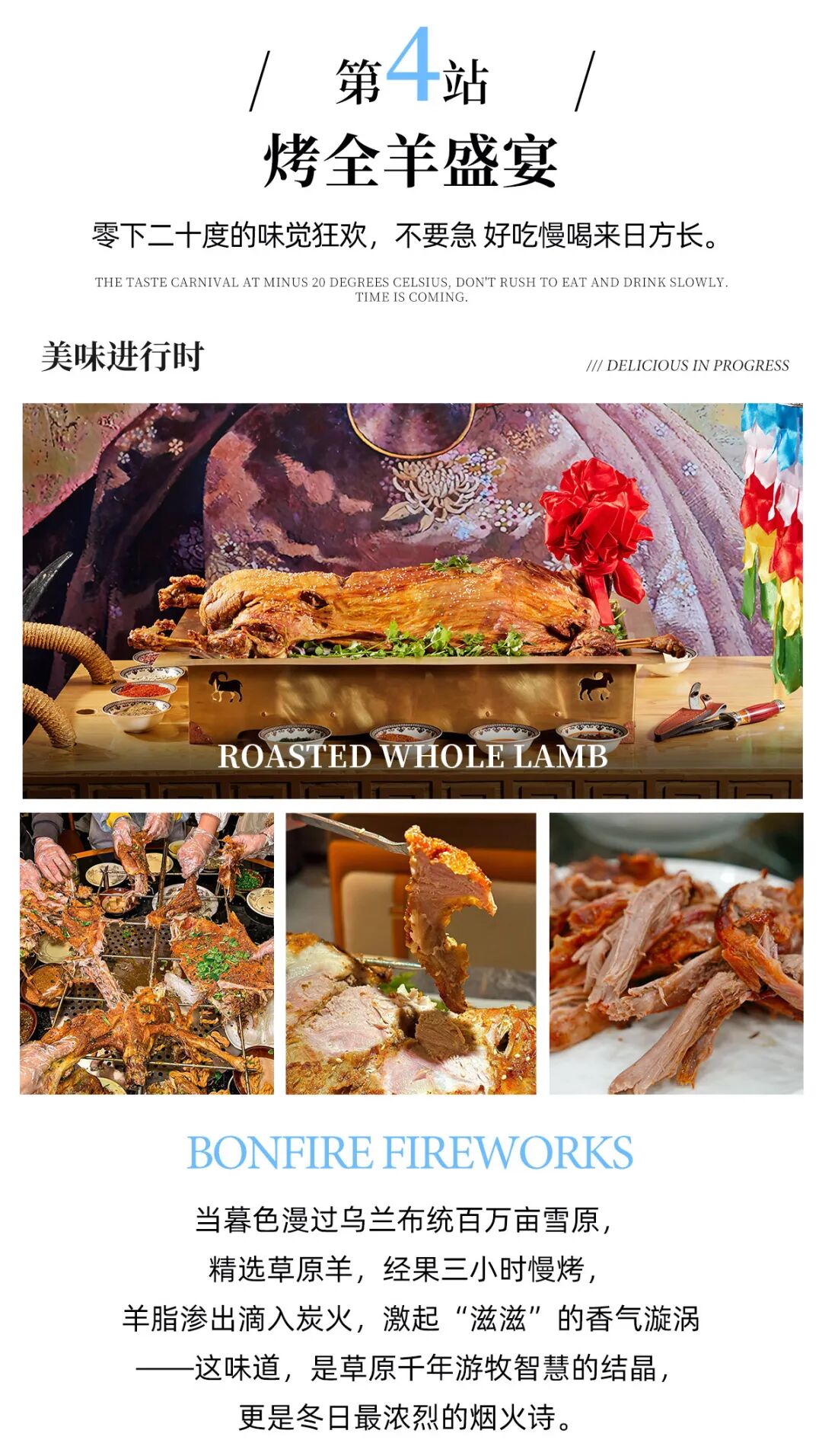 [用餐]全程包含4早餐+2正餐(1餐为团餐&烤羊;1餐为火锅涮肉 ,烤羊/团/只,不足十人为烤羊腿)