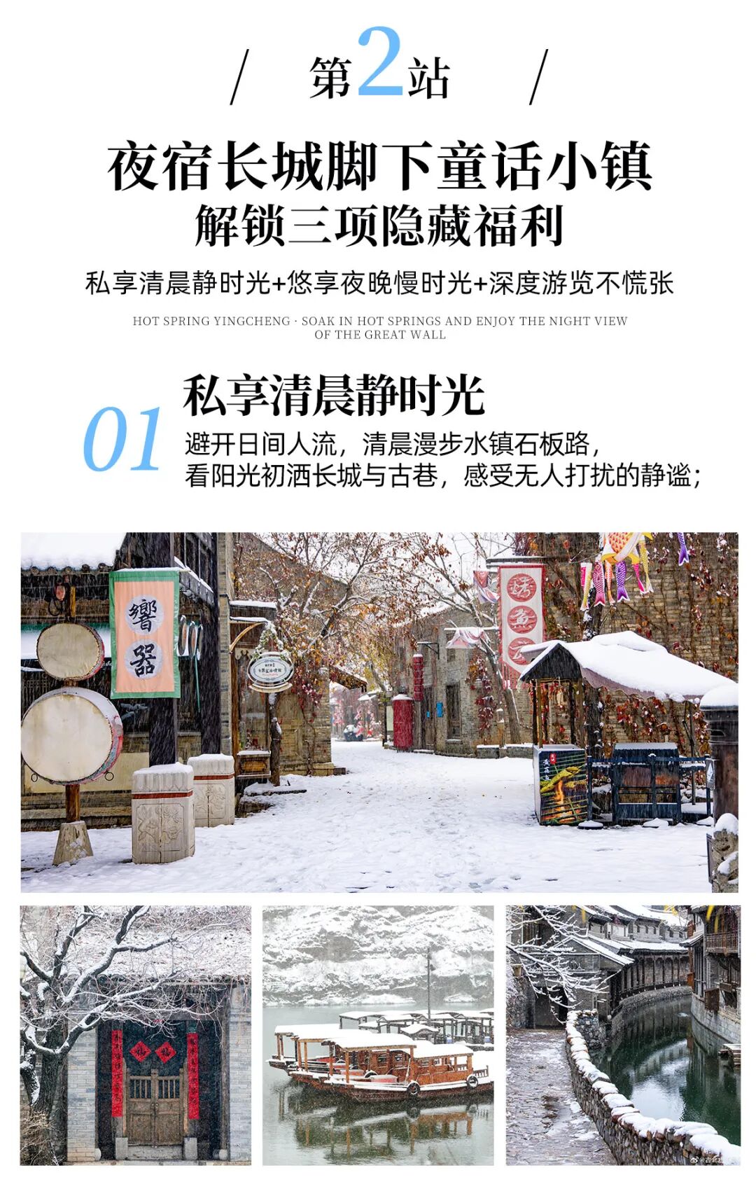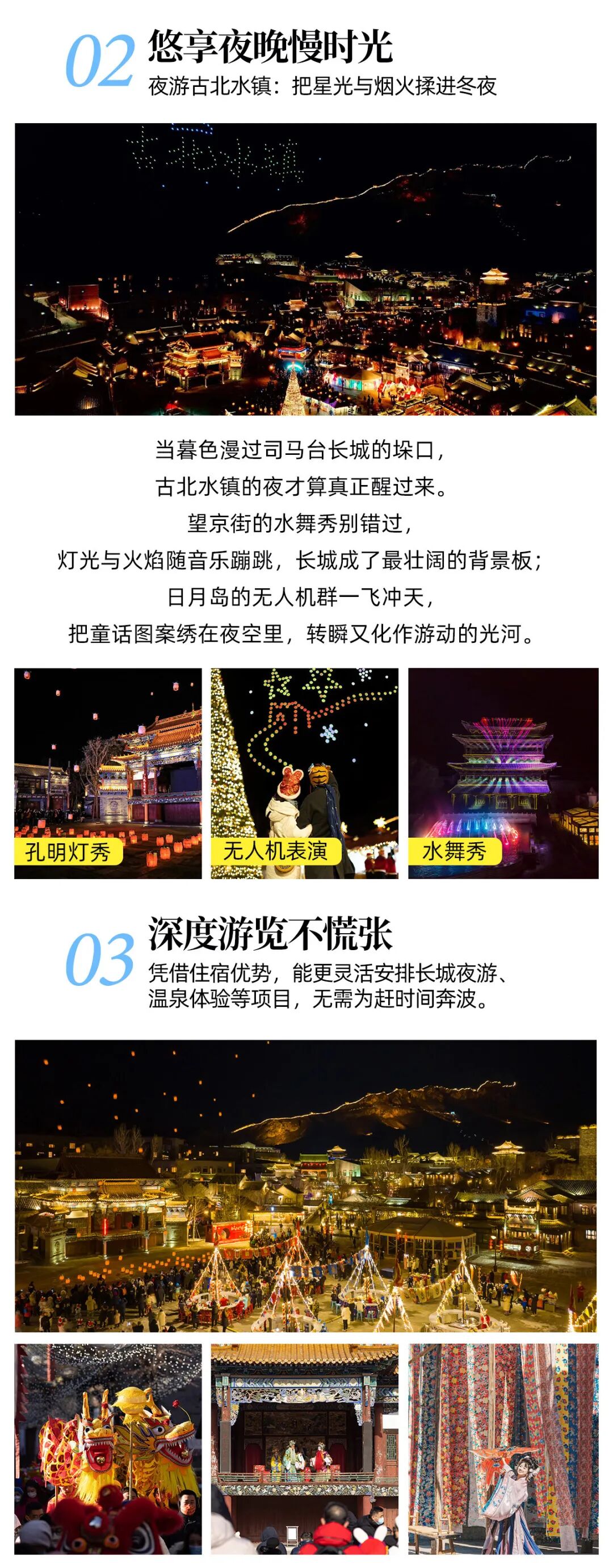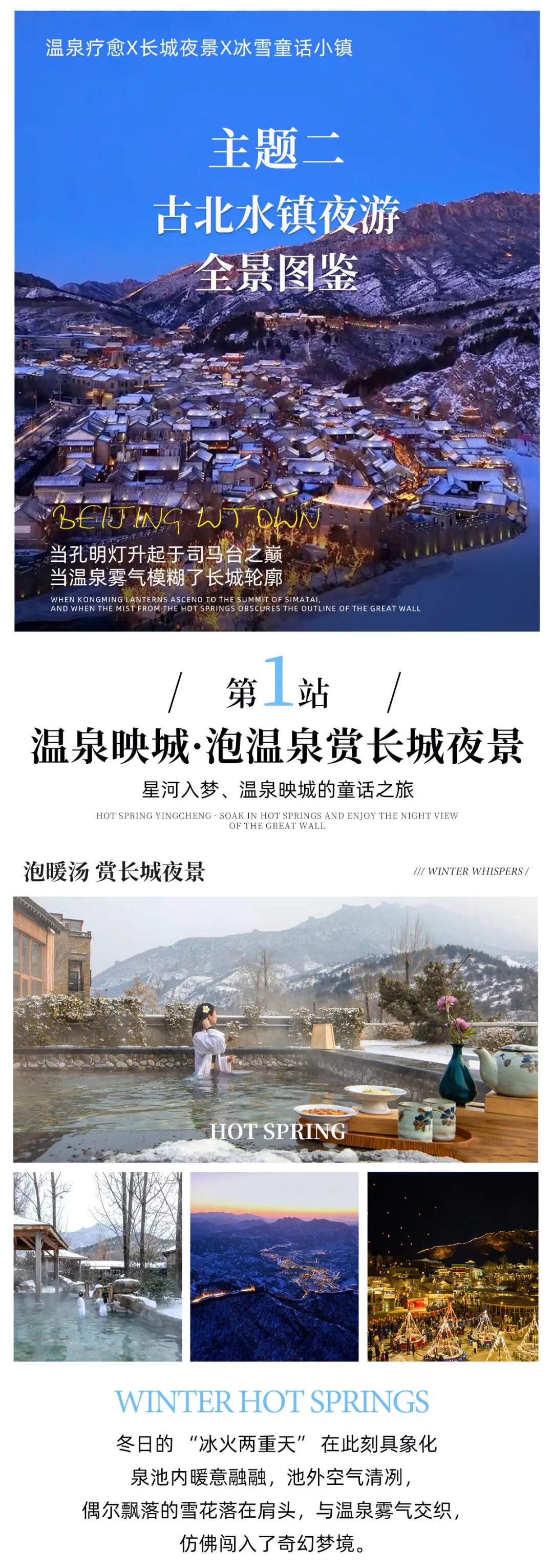 🚌乘车前往古北水镇,夜游🧱长城脚下的❄️冰雪童话小镇,🥋泡汤泉赏长城雪景
