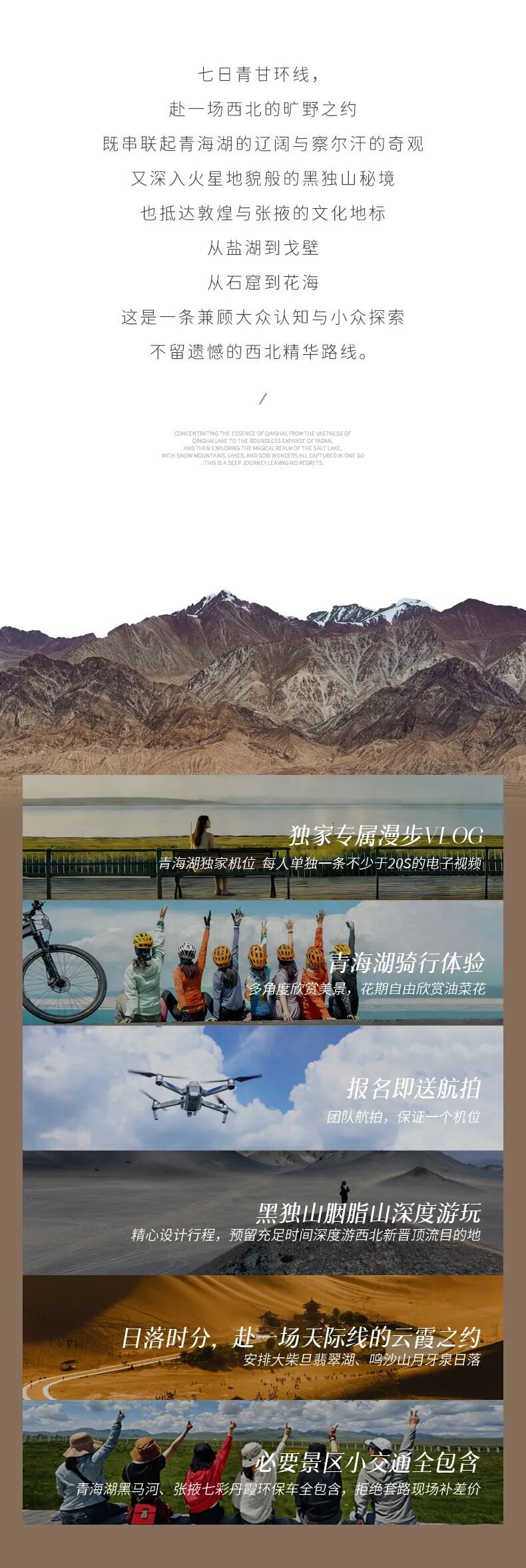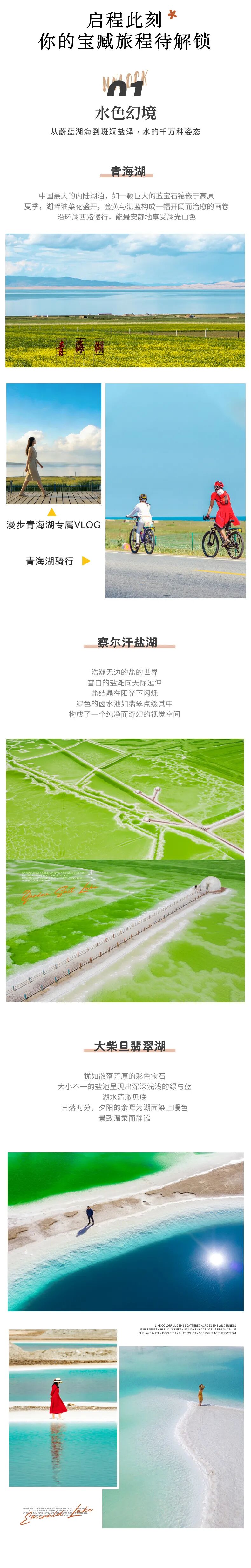 这里晴天光线很强,还有湖面的反射,需做好防晒准备,建议准备墨镜保护眼睛;4、青海湖如遇政府管制,可能无法在湖边车道进行骑行体验。5、今日行程较丰富,车程较长,请大家做好心理准备。6、青海湖漫步vlog电子视频(5月1日及以后团期赠送,如团期无法安排则改为赠送一个机位的团队航拍视频或同价值体验)
