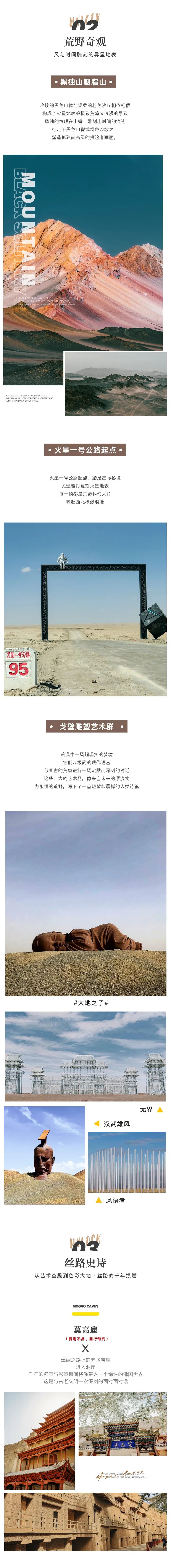 2、戈壁轻徒步可能白天较热,大家一定要做好防晒,量力而行。3、火星一号公路起点非常规景区,如遇不可抗力或政府管制则取消游览。4、黑独山胭脂山景区内前往胭脂山脚下环保车20元自理,胭脂山根据您自身体力情况选择是否游玩(黑独山步行游览,胭脂山非必需可远观)
