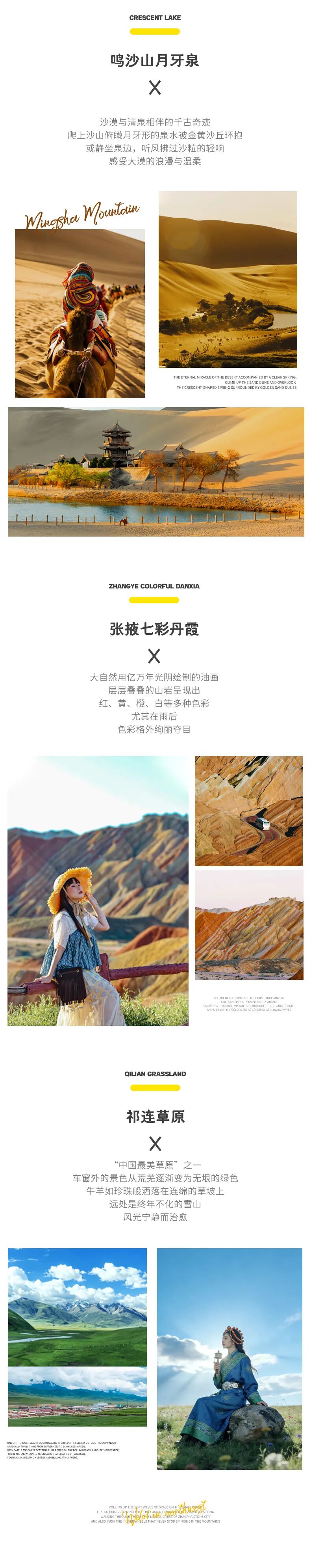 敦煌-(100km,约1.5h)大地之子/无界/风语者/汉武雄风-(480km,约6h)-张掖七彩丹霞日落