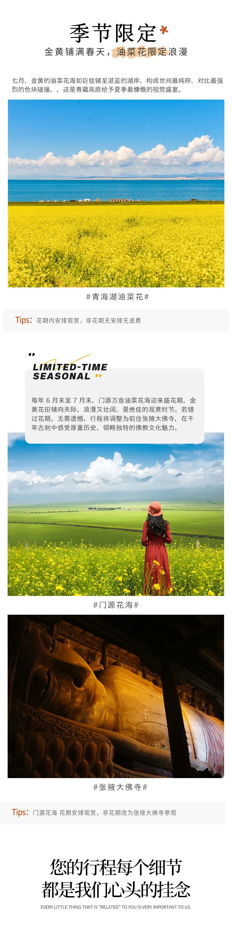2、不含门源花海观景台门票60元及环保车费用15元(行程赠送门源花海农家田间参观费用,如想游览观景台可根据自身情况前往,费用自理)3、如非门源花期则改为上午前往张掖大佛寺参观游览,取消门源花海行程。