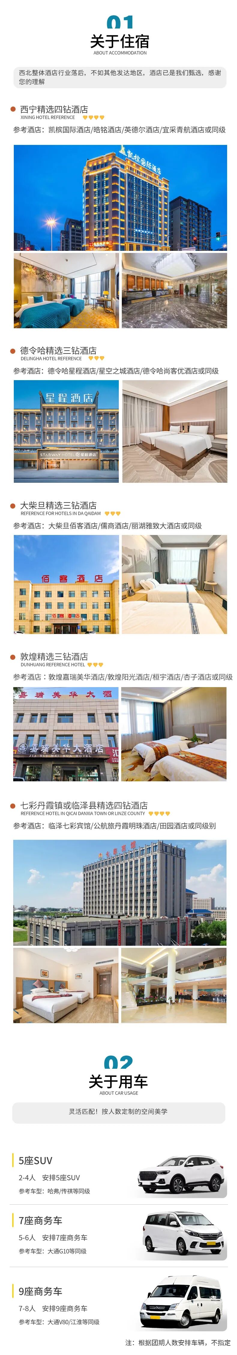 用车:2-4人用5座SUV,5-6人用7座商务车,7-8人用9座商务车(小团副驾驶及前后座位置需要轮流乘坐,望悉知)门票:青海湖黑马河观景台环保车、察尔汗盐湖+环保车、大柴旦翡翠湖、黑独山环保车、鸣沙山月牙泉、七彩丹霞+环保车