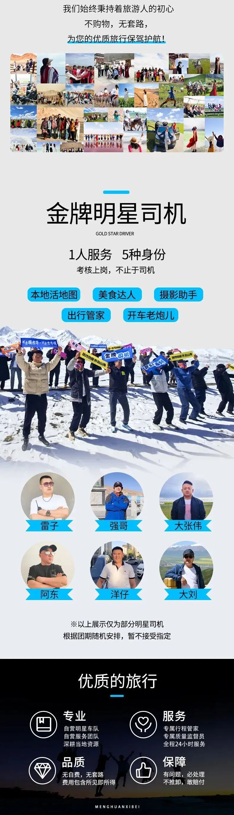 领队:司机兼管家,帮助大家购买门票,给团友游玩建议,无法进入景区和提供专业讲解等服务,敬请谅解;