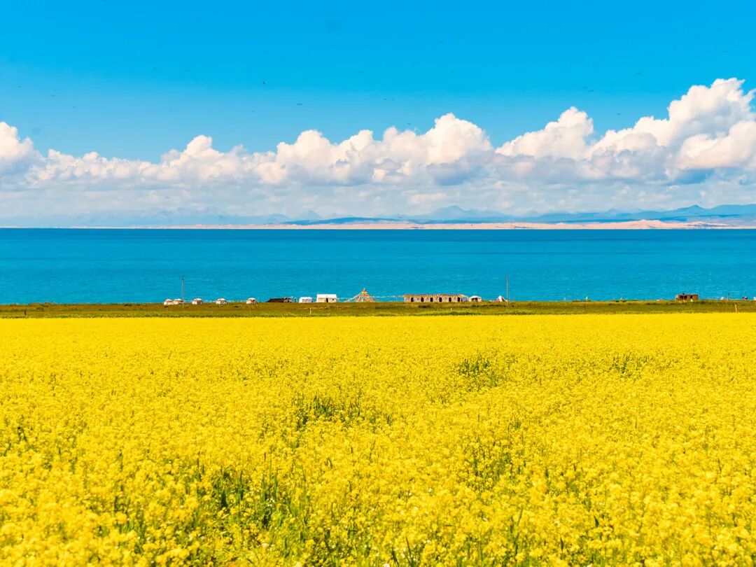 10:30抵达中国最大的内陆湖泊【青海湖】(非二郎剑景区,安排青海湖小众观赏地,人少且景美),碧波万顷的湛蓝外围散布着金灿灿的亮黄【油菜花】(花期在6月末-8月中旬);高山牧场的野花五彩缤纷,如绸似锦,数不尽的牛羊膘肥体壮,点缀其间,我们随后三五成群进行【青海湖骑行体验】,骑着自行车感受着青海湖的美景,真希望时间在这一刻停留。11:30适时中午用餐,大家可以自由用餐或者AA,如遇旺季堵车可能改为路餐。